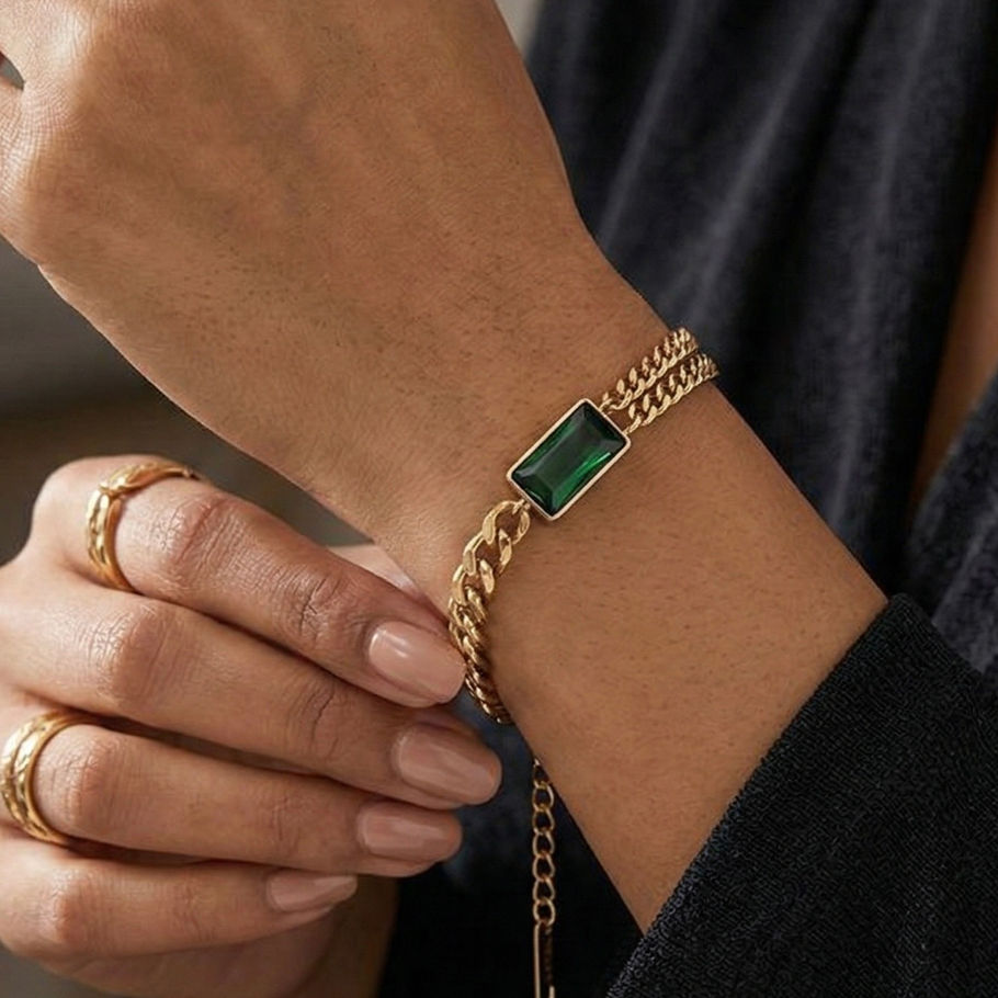The Emerald Regent Bracelet is where bold architecture meets refined luxury. Anchored by a deep emerald-cut rectangular stone, this piece is framed in polished gold and set against layered chain detailing that creates depth, movement, and undeniable presence. The geometric centerpiece introduces modern sharpness, while the dual-chain structure enhances its regal character.