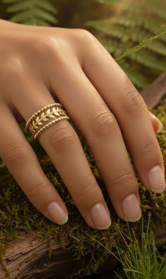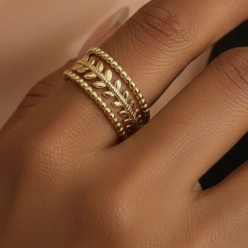 Structured, elegant, and quietly powerful — the Verdant Grace Band is designed for the woman who finds strength in subtle detail. Featuring layered textures with delicate leaf-inspired cutwork framed by fine rope edging, this ring captures nature’s rhythm in a refined gold silhouette.